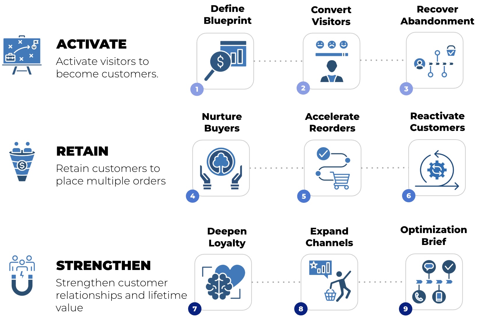 You’re losing 95% of your visitors with no way to bring them back. Phase 1 fixes that by converting more visitors into first-time buyers and lowering your cost of acquisition. This phase includes 4+ Automations and 15+ emails and goes live in 1-2 weeks.